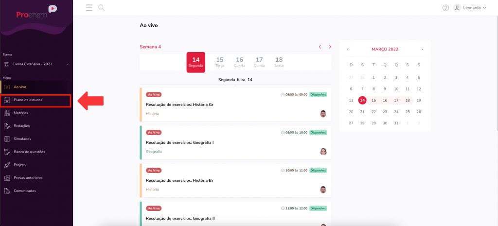 Ao acessar a plataforma, você deverá escolher em qual a turma deseja navegar (conforme plano contratado); selecionando a turma, o primeiro ícone do menu principal será o plano de estudos.